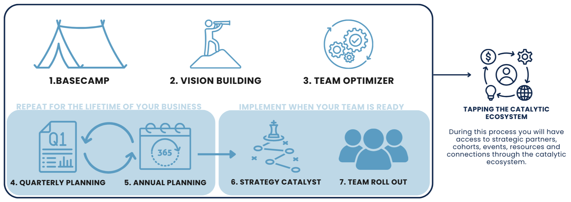 We do more than help you implement a business model—we connect your organization to a network of leaders.(ie. marketing leader can tap into the ideas, support, and resources of every other marketer in the Catalytic Ecosystem.) And that same cross-support happens across every major area of business; Finance, operations, Marketing/Sales, people, point leaders.